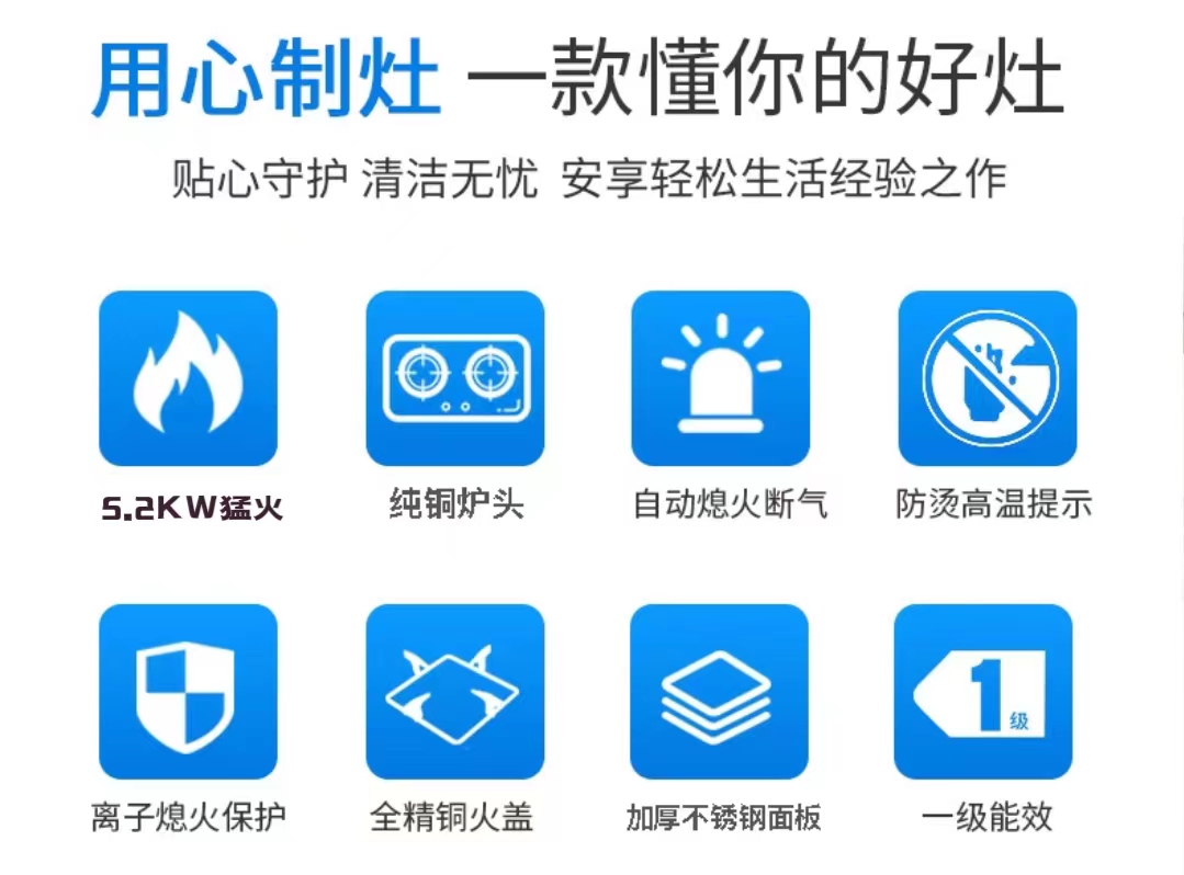 一级能效 5.2KW猛火 轻松做好各种美食 创新风门调节 炉头下面可直接调节风门 面板材质:加厚不锈钢 能效等级:一级 燃气类型:液化气/天燃气 热负荷:5.2KW 产品尺寸:750X430mm 嵌入尺寸:650X350mm