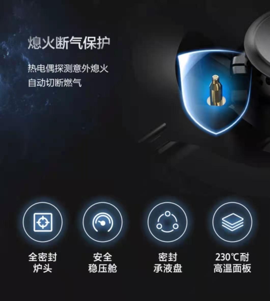 功率5.0kw大火力 蝶形聚能盘 三腔混合更节能 零秒启动延时开关 防锈隔热底壳 航空合金分火器 纯铜保洁火盖 爆炒出“味” 天下领“鲜”