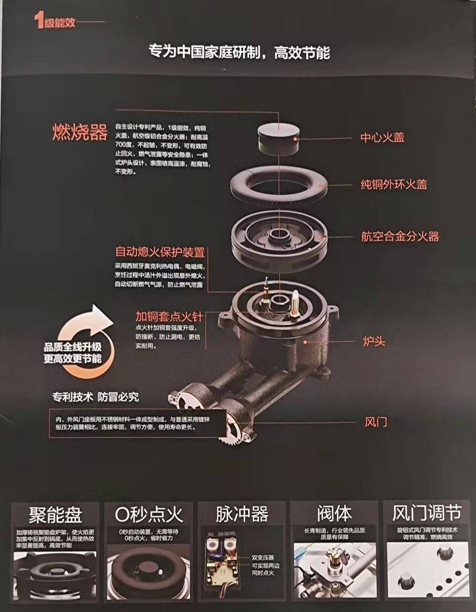 功率5.0kw大火力 蝶形聚能盘 三腔混合更节能 零秒启动延时开关 防锈隔热底壳 航空合金分火器 纯铜保洁火盖 爆炒出“味” 天下领“鲜”